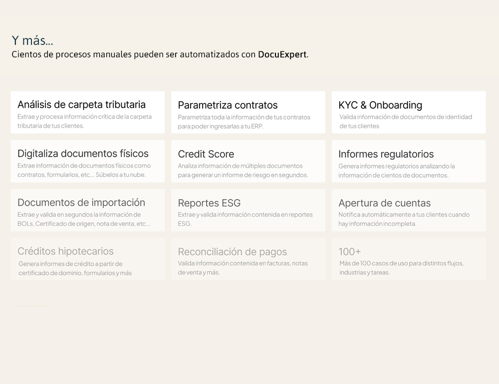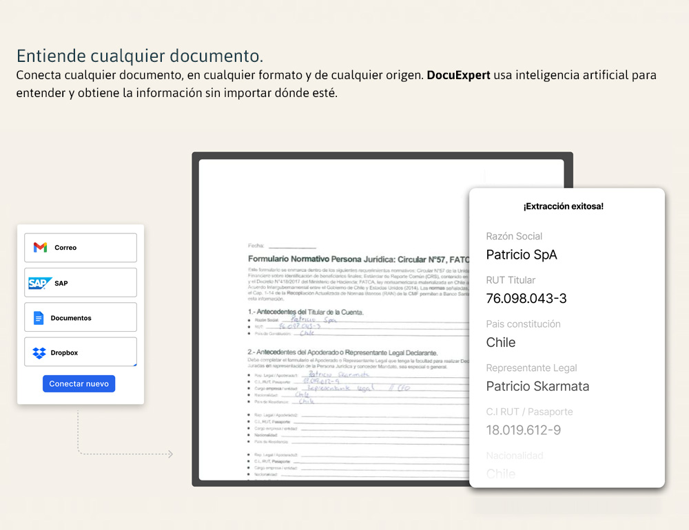 En DocuExpert nos especializamos en ofrecer soluciones tecnológicas personalizadas para automatizar la clasificación y comprensión de textos, imágenes y audios, extrayendo información con alta precisión desde documentos no estructurados. Estos servicios se adaptan a diferentes procesos operativos, permitiendo gestionar la información junto con otras fuentes de datos, lo que optimiza la gestión de procesos masivos.
