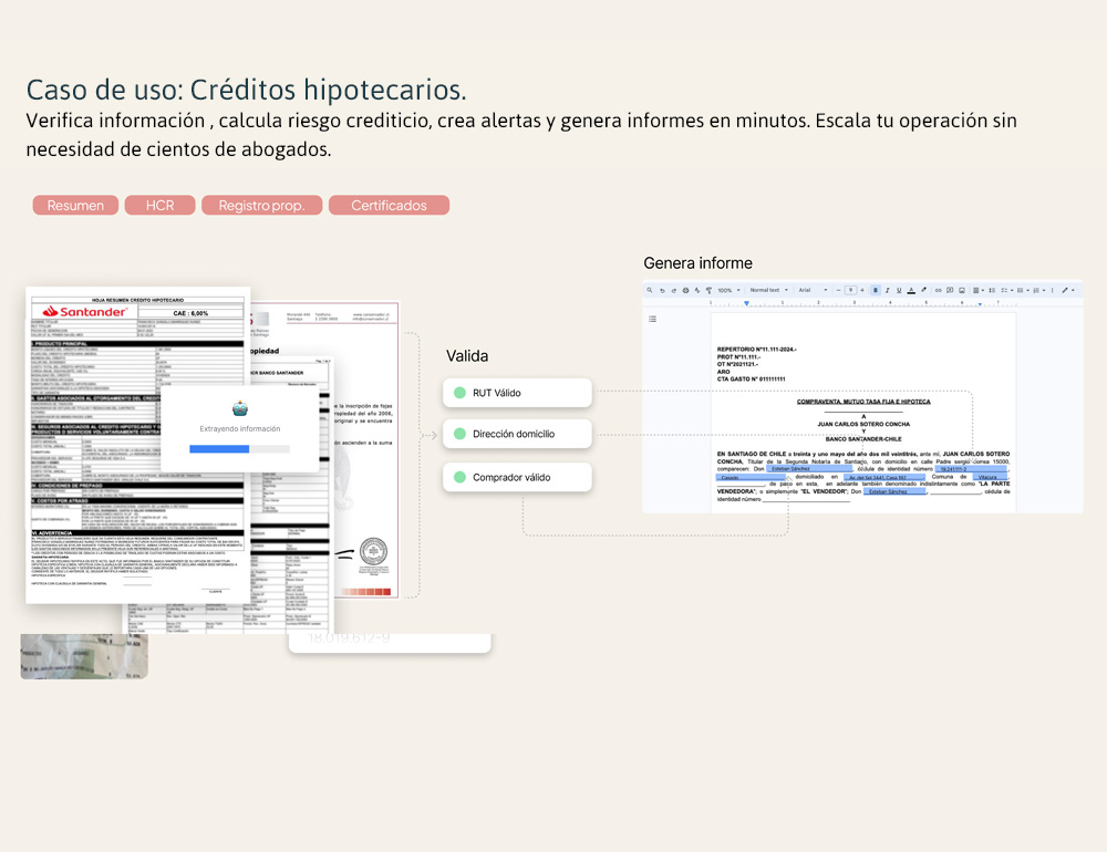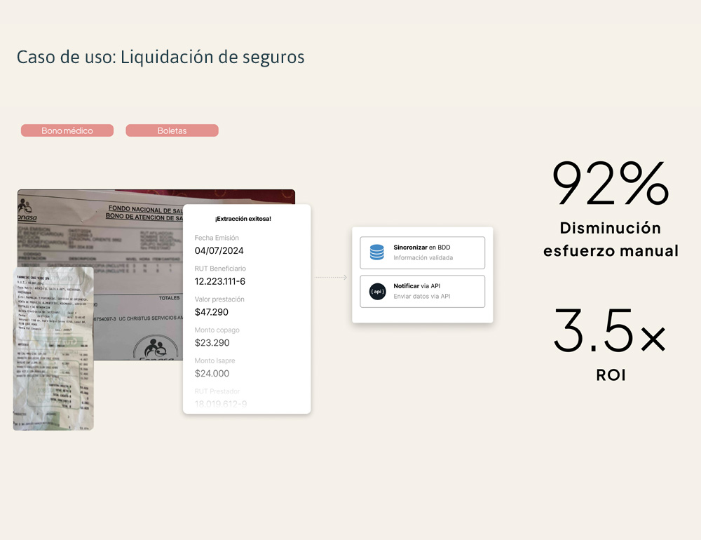 Implementamos modelos de IA especializados para cada caso de uso de los clientes, extrayendo información y luego realizar validaciones y tareas definidas.